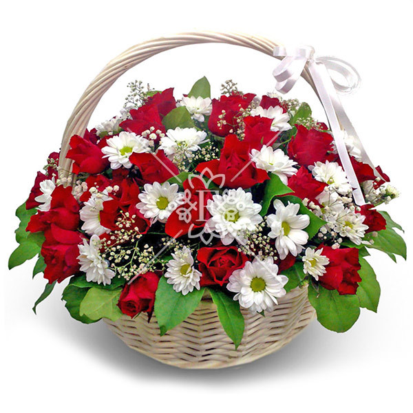 Чудесные алые розы создают гармоничное и нежное сочетание с белоснежной кустовой хризантемой, украшены  декоративной зеленью и оформлены в очаровательную плетеную корзинку!